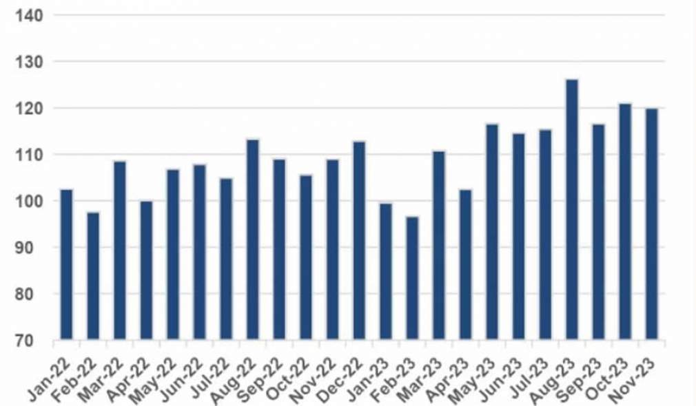 No segmento de infraestrutura, por sua vez, o IODE-PMEs de novembro mostrou estabilidade da movimentação financeira real das PMEs (-0,1% YoY) com avanço das atividades no segmento ‘Serviços especializados para construção’, mas fracos resultados em ‘Construção de edifícios’ e ‘Obras de infraestrutura’.