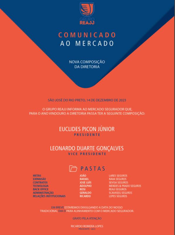O cargo de Presidente, anteriormente ocupado pelo Corretor Ricardo R. Lopes, da Lopes Corretora de Catanduva, foi assumido por Euclides Picon Júnior da Picon Corretora, também sediada em Catanduva. Esta mudança reflete não apenas uma alternância no comando, mas também uma nova abordagem na gestão e direcionamento estratégico do Grupo REAJJ.
