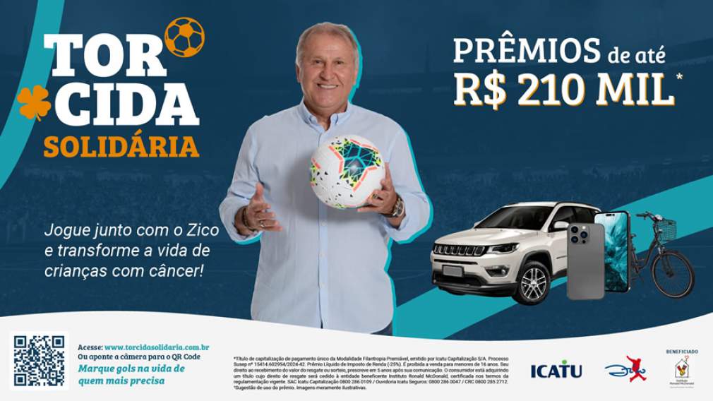 O torcedor brasileiro é reconhecido como um dos mais engajados do mundo. Aproveitando essa paixão, a Icatu se une a Zico, um dos maiores ícones da história do futebol no País, para lançar o Torcida Solidária, produto de Capitalização na modalidade filantropia premiável que destina recursos a instituições sociais. A partir de R$ 10, torcedores poderão apoiar diretamente o Instituto Ronald McDonald, uma organização sem fins lucrativos que há quase 30 anos atua para ajudar famílias no combate ao câncer infantojuvenil – ao mesmo tempo em que conc
