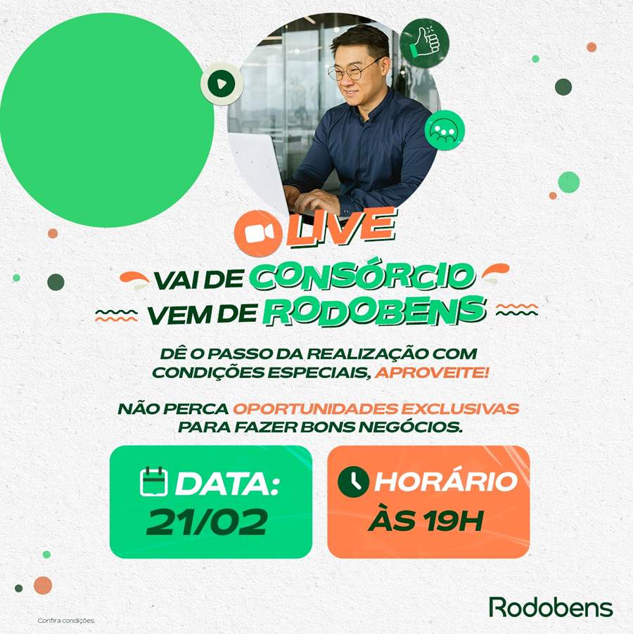 Nesta quarta, 21, às 19h, acontece a live “Vem de consórcio, vai de Rodobens”, no canal do Youtube da marca, com ofertas exclusivas para os clientes.