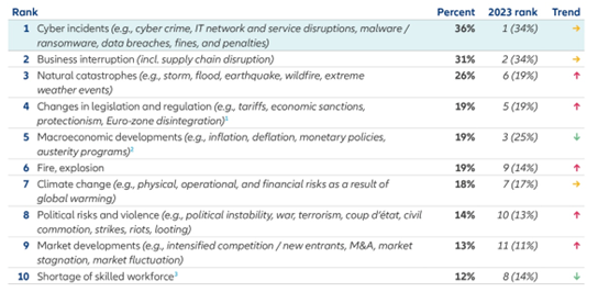 - Interrupção nos negócios permanece em segundo lugar, com 31%. Catástrofes naturais são a maior ascensão em comparação com 2023, com 26% em terceiro lugar.