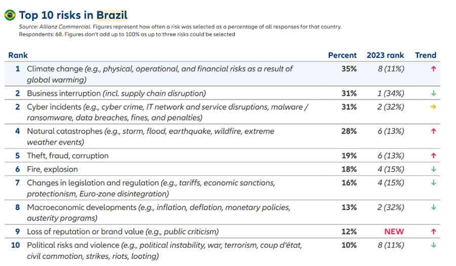 Um dos maiores movimentos na pesquisa deste ano é o de mudanças climáticas. Em um sinal de que as empresas estão sentindo o impacto de eventos climáticos extremos, ele ocupa a 3ª posição, subindo três posições em relação ao ano anterior. O ano de 2023 foi novamente de recordes em vários aspectos. Foi o ano mais quente desde o início dos registros, segundo a Organização Meteorológica Mundial, enquanto as perdas seguradas, em 2023, no mundo, superaram US$100 bilhões pelo quarto ano consecutivo. As perdas por tempestades severas atingiram uma nova alta histórica de US$60 bilhões, em âmbito global. A quebra de recordes climáticos, em 2023, incluiu temperaturas da superfície do mar, aumento do nível do mar e baixa cobertura de gelo marinho na Antártica. As mudanças climáticas (18%) apesar de não terem se movido ano após ano no Allianz Risk Barometer, permanecendo em 7º, são refletidas no aumento do risco das catástrofes naturais no ranking. É considerado prioridade para grandes empresas (ocupando o 4º lugar, sua posição mais alta até então), sendo o principal risco no Brasil e na Turquia, e subindo ano após ano em muitos países, como França, Alemanha, Itália, Nigéria, Cingapura, Espanha, Reino Unido e Estados Unidos.
