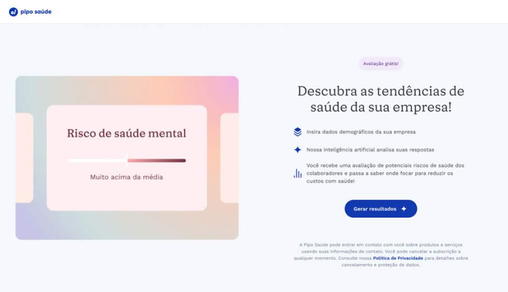 Enxergando uma oportunidade em seu próprio banco de dados e usando inteligência artificial, a Pipo Saúde lança uma calculadora de tendências de saúde que, por meio de apenas algumas perguntas simples, consegue estimar a probabilidade de riscos da saúde dos colaboradores e ainda questões relacionadas à sinistralidade. Com perguntas como “quantos funcionários têm a empresa” e “idade média dos colaboradores”, a calculadora analisa os dados e mostra os resultados de tendências instantaneamente.