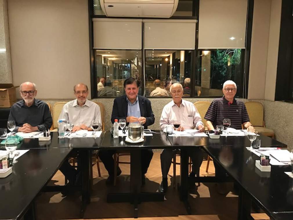 Ex-reitores do Clube da Bolinha na mesa central do jantar. Da esquerda para direita: Marcus Clementino e Neival Freitas (ex-reitores), seguidos por Gilberto Villela e Jorge Carvalho (atuais membros da reitoria) e, Oswaldo Mário, ex-reitor – Foto: Divulgação