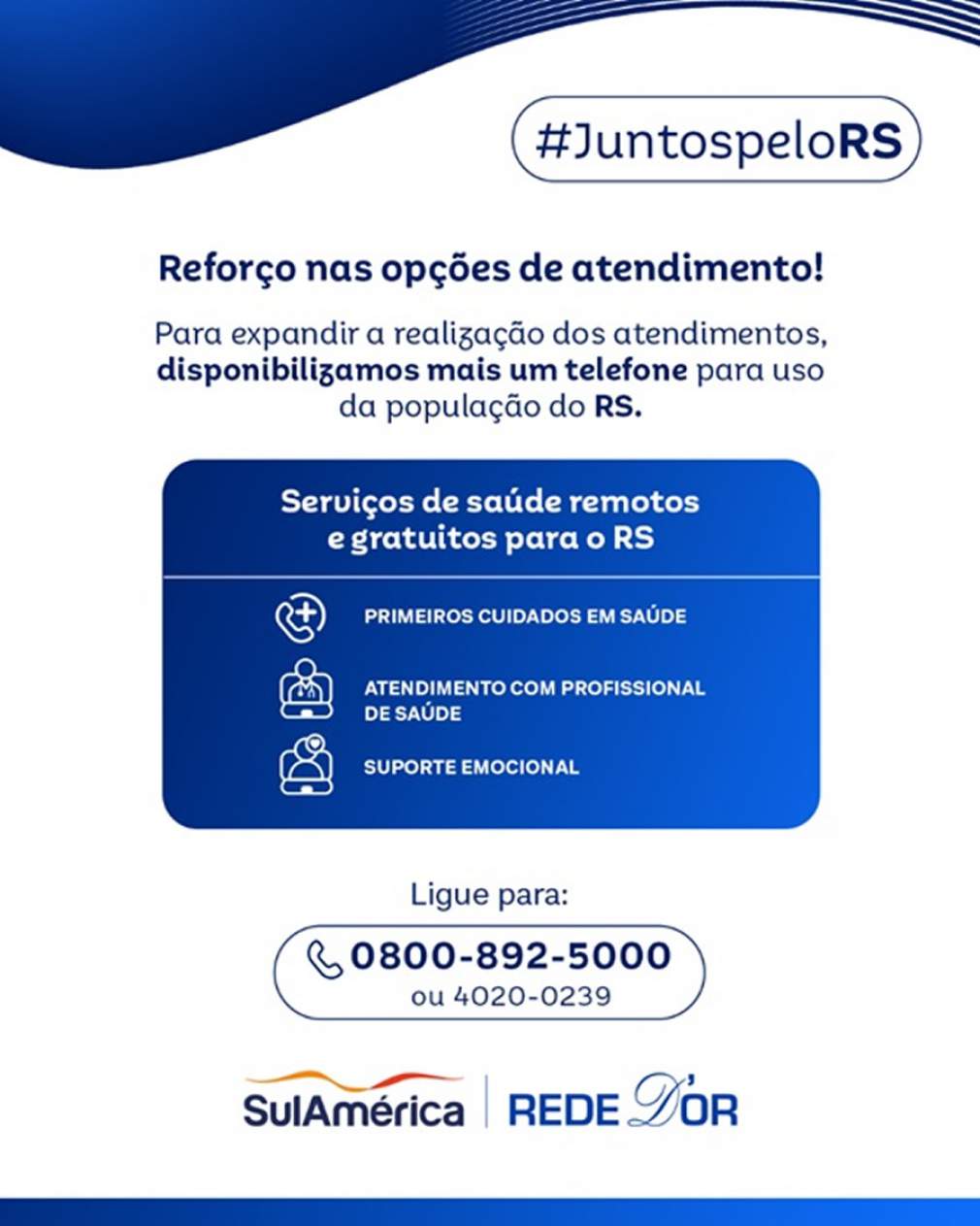Além dessas ações, a SulAmérica está tomando medidas específicas para garantir atendimento médico imediato às vítimas das enchentes. Foi disponibilizado um telefone 0800 para orientação médica por telefone, com enfermeiras disponíveis 24 horas por dia, 7 dias por semana, com transbordo para médicos, se necessário, durante o horário comercial.