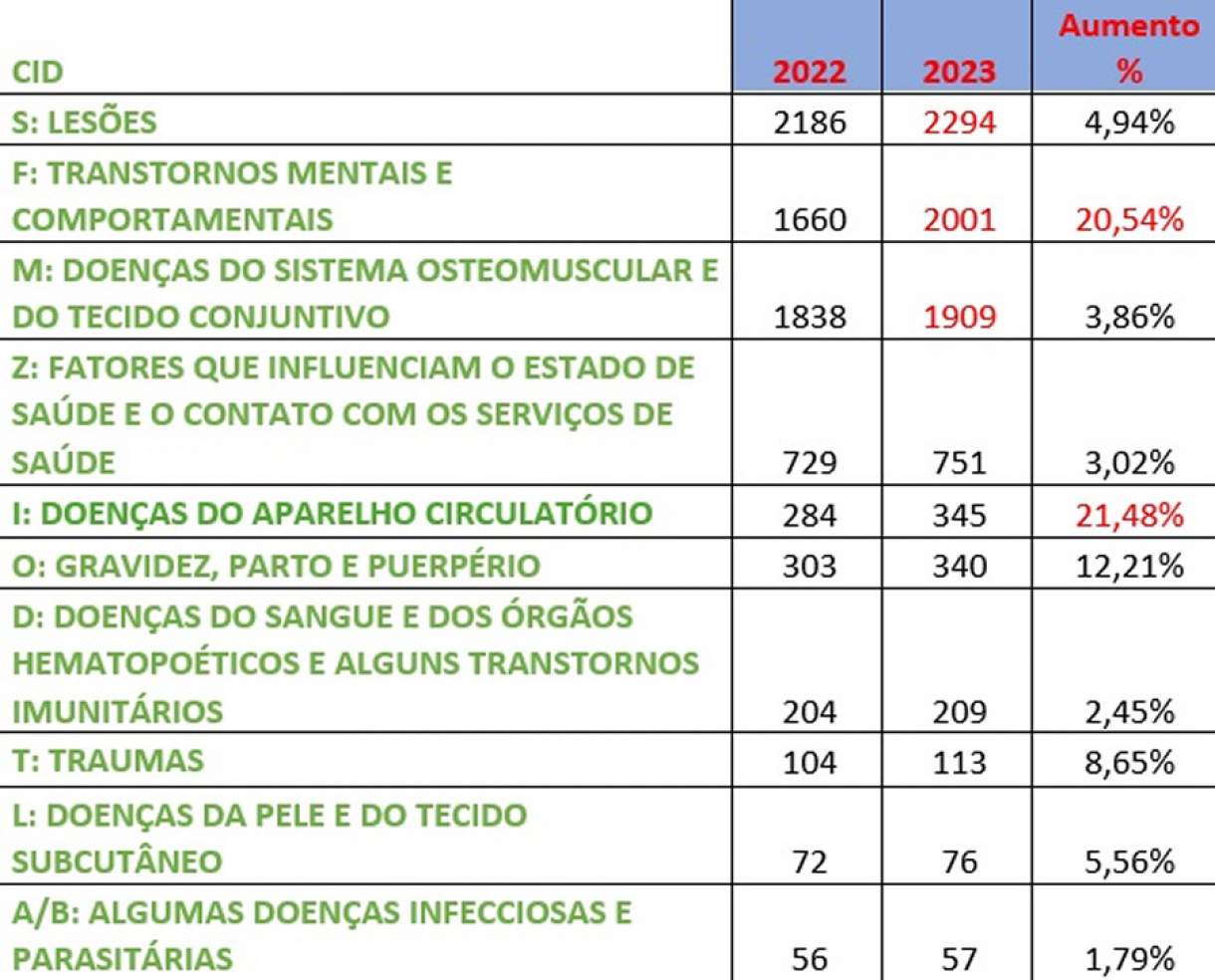 O estudo apontou que os transtornos mentais registraram aumento de 20,54% na comparação com 2022, subindo do terceiro para o segundo motivo mais frequente de afastamentos. Já as doenças do aparelho circulatório cresceram 21,48%, saltando da sétima para a quinta colocação.