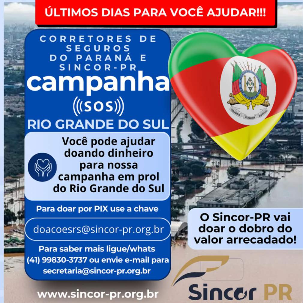 O Sincor-PR, juntamente com os Corretores de Seguros do Paraná, reforça o pedido para que você colabore com a campanha em prol do Rio Grande do Sul.