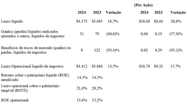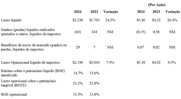 - O retorno sobre o patrimônio líquido (ROE) anualizado foi de 14,7%. O lucro operacional sobre o patrimônio tangível (ROTE) anualizado foi de 21,1% e o ROE operacional anualizado foi de 13,3%.