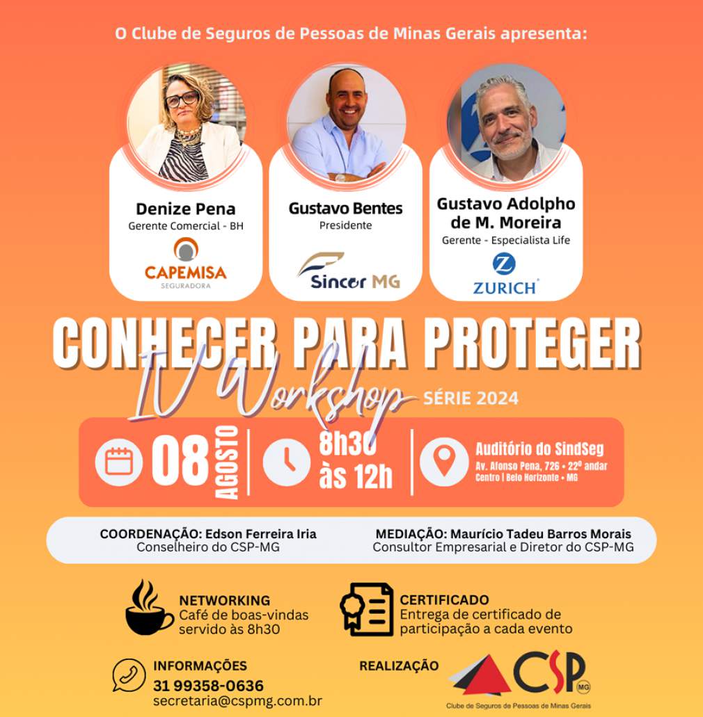O Clube de Seguros de Pessoas de Minas Gerais (CSP-MG) recebe, no dia 8 de agosto, as mantenedoras CAPEMISA Seguradora e Zurich, além do Sincor-MG (benemérita honorária) no IV Workshop Conhecer para Proteger, que será realizado no auditório do SindSeg MG/GO/MT/DF, em Belo Horizonte.