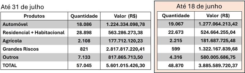 Os dados referentes às solicitações de pagamento de seguros automóvel e agrícola em julho tiveram uma leve redução frente aos números anunciados em junho. Isso é resultado de ajustes nos dados repassados pelas seguradoras, já que o levantamento é referente aos avisos de sinistros e não de pagamentos efetivados.
