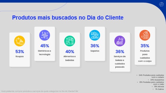 De acordo com dados, as categorias de produtos mais procuradas para o Dia do Cliente incluem roupas (53%), eletrônicos e tecnologia (45%), seguidas por alimentos e bebidas (40%), sapatos (36%) e serviços de beleza e cuidados pessoais (36%). Produtos para o corpo (35%), cabelo (34%) e acessórios (34%) também aparecem entre os itens mais desejados. Acessórios são os preferidos de 53% dos jovens de 18 a 24 anos, enquanto serviços de beleza têm 24 pontos percentuais a mais entre mulheres do que homens. Já entre o público masculino, eletrônicos e tecnologia lideram com 15 pontos percentuais a mais.