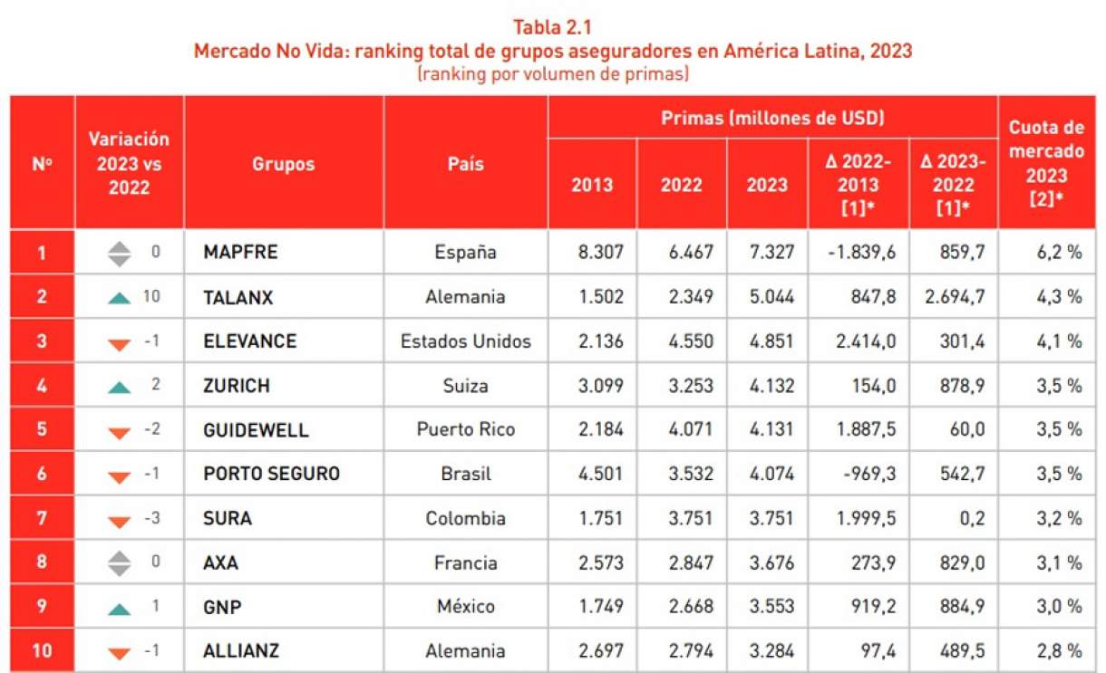 Em 2023, o ramo de Não Vida representou 57,7% dos prêmios na região, mantendo a porcentagem do ano anterior. Os mercados que apresentaram o maior crescimento foram México, com um aumento de 34,4%, Costa Rica com 24,4% e Argentina com 21,3%. Brasil, com 22,5% da participação de prêmios, México com 21,1% e Argentina com 15,9% são os mercados mais representativos neste ramo. Por grupos, a MAPFRE lidera o ranking de Não Vida com prêmios de 7.327 milhões de dólares (13,3% a mais) e uma participação de mercado de 6,2%, à frente de outros concorrentes como a alemã Talanx ou a americana Elevance.