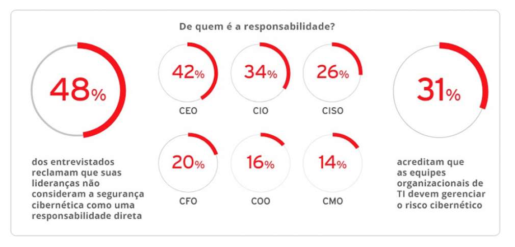 O fracasso da maioria das empresas globais em alcançar estes princípios básicos de segurança cibernética pode ser atribuído à falta de liderança e responsabilidade no topo da organização. Metade dos entrevistados (48%) afirmou que suas lideranças não veem a segurança cibernética como uma responsabilidade direta e mais da metade (54%) reclamou que a atitude da empresa em relação ao risco cibernético é inconsistente e varia de mês para mês.