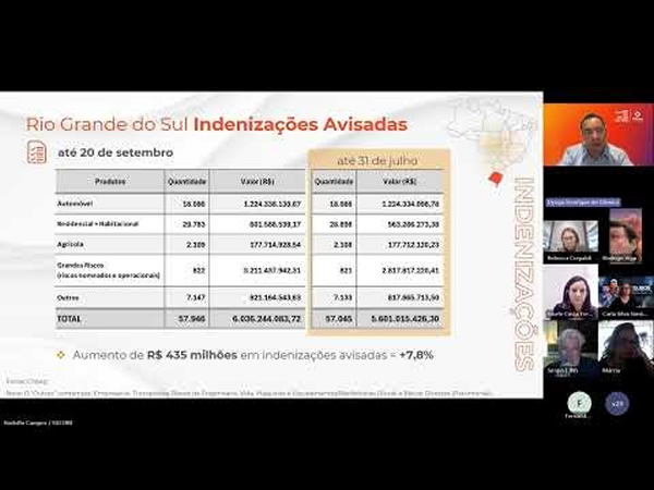 O volume total de pedidos de indenizações de seguros relacionados à enchente no Rio Grande do Sul cresceu quase 8% entre 31 de junho e 20 de setembro. O quarto levantamento elaborado pela CNseg junto às suas associadas mostra que os pedidos de indenizações dos clientes junto às seguradoras superaram R$ 6,0 bilhões, uma adição de R$ 435 milhões ao divulgado em 2 de agosto, quando os registros somaram R$ 5,6 bilhões.