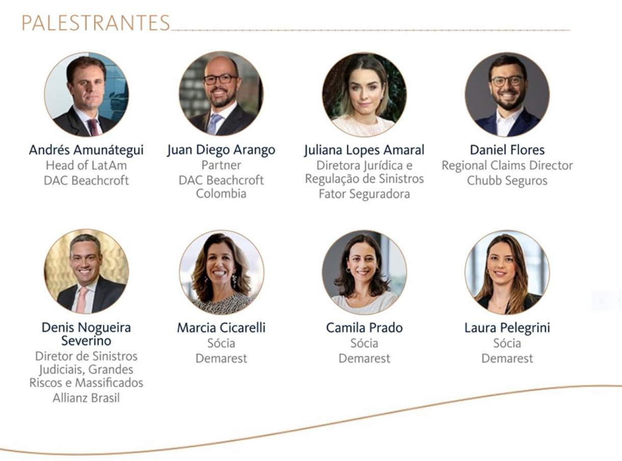 Os palestrantes vão debater aspectos relevantes do sinistro cibernético, do seguro garantia e do sinistro de responsabilidade civil geral (RCG) em três painéis de discussão com especialistas da área de Seguros, Resseguros, Previdência Complementar e Saúde Suplementar do Demarest Advogados e representantes de empresas do setor, como DAC Beachcroft, Fator Seguradora, Chubb Seguros e Allianz Brasil.