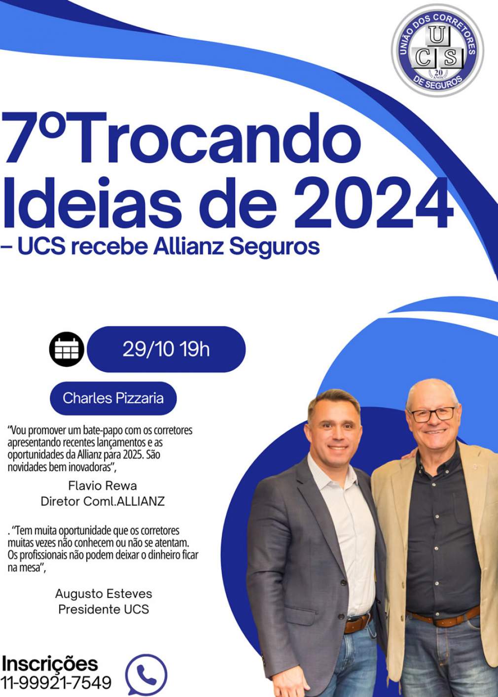 A União dos Corretores de Seguros (UCS) recebe a equipe comercial da Allianz na noite de 29 de outubro, em seu 7º Trocando Ideias de 2024, o último encontro presencial do ano antes da grande festa de confraternização que acontece em novembro. O evento realizado na Charles Pizzaria, na zona sul de São Paulo, é aberto a todo o mercado de seguros, incluindo corretores de seguros associados ou não.