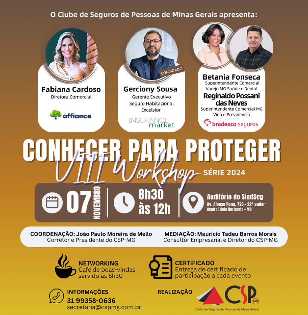 No próximo dia 7 de novembro, o Clube de Seguros de Pessoas de Minas Gerais (CSP-MG) realiza o VIII Workshop Conhecer para Proteger, no auditório do SindSeg MG/GO/MT/DF, em Belo Horizonte.
