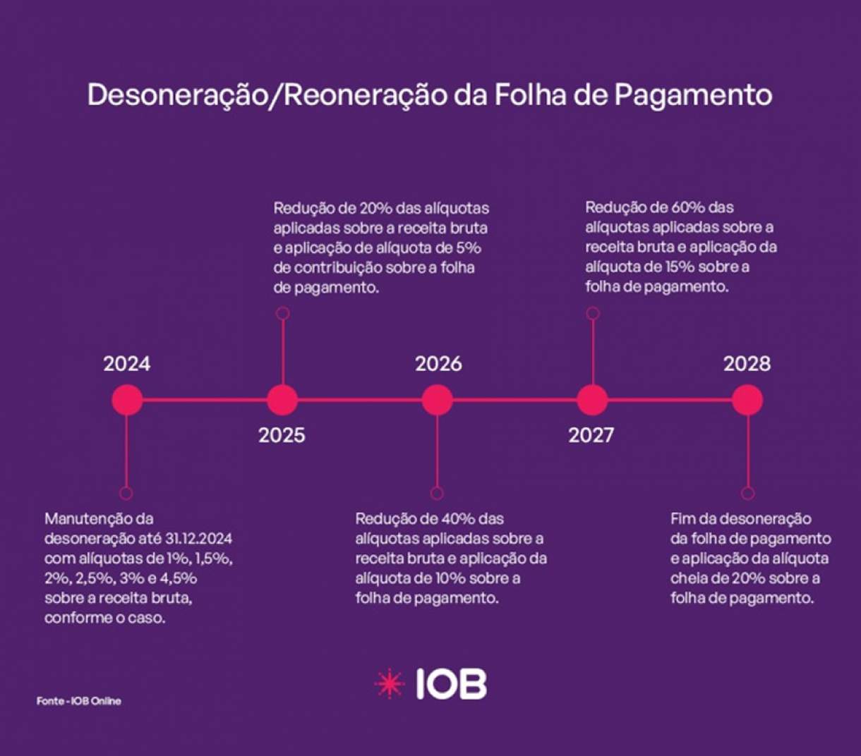 O quadro a seguir, produzido pela IOB, mostra como será o período de transição até o fim da desoneração da folha de pagamento em 2028: