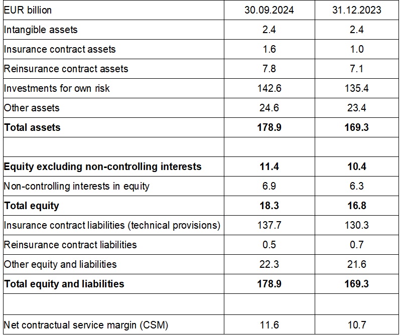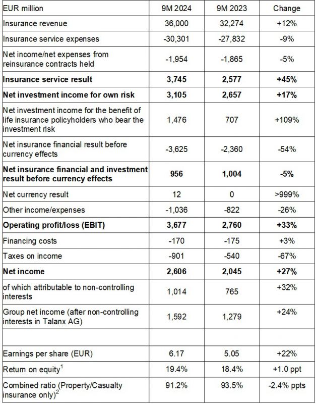 O resultado financeiro e de investimento líquido de seguros antes dos efeitos cambiais permaneceu quase estável em 956 (1.004) milhões de euros. O lucro operacional (EBIT) cresceu 33% para 3,7 (2,8) mil milhões de euros, enquanto o lucro líquido do Grupo aumentou 24% para 1.592 (1.279) milhões de euros. O rácio Solvência 2 em 30 de setembro de 2024 era de 220 por cento (30 de junho de 2024: 218 por cento).