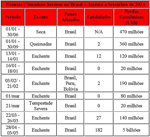 O relatório ressalta os eventos catastróficos significativos que impactaram o país, com destaque para o prejuízo de US$ 5 bilhões provocado pelas enchentes no estado do Rio Grande do Sul entre 28 de abril e 3 de maio, as queimadas que atingiram a vegetação brasileira entre janeiro e setembro, resultando em danos estimados de US$ 360 milhões e a seca histórica, que gerou perdas no valor de US$ 470 milhões.