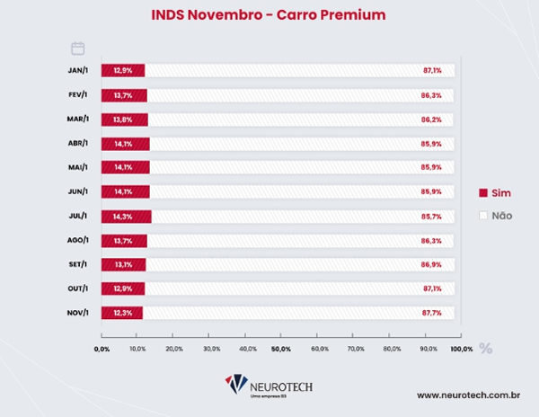 O Índice Neurotech de Demanda por Seguros (INDS) abrange o universo das principais seguradoras brasileiras e mensura o apetite do brasileiro a assegurar o seu automóvel. Nem todas as milhões de consultas mensais registradas se transformam em apólices contratadas, pois o processo depende de fatores como o perfil da pessoa que está fazendo a solicitação, o apetite ao risco da seguradora e se há ou não indícios de fraude.