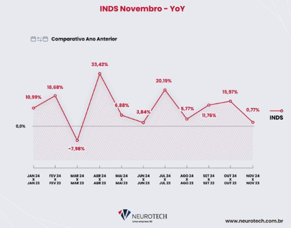 A demanda do mercado brasileiro de seguros de automóveis aumentou apenas 0,77% em novembro, em comparação com o mesmo mês de 2023. Já na comparação com o mês anterior, outubro de 2024, o cenário foi de queda, com um recuo de 12,49%. Os dados são do Índice Neurotech de Demanda por Seguros (INDS), que mede mensalmente o comportamento e o volume das consultas na plataforma da Neurotech, empresa pioneira em soluções de inteligência artificial aplicadas a seguros e crédito.