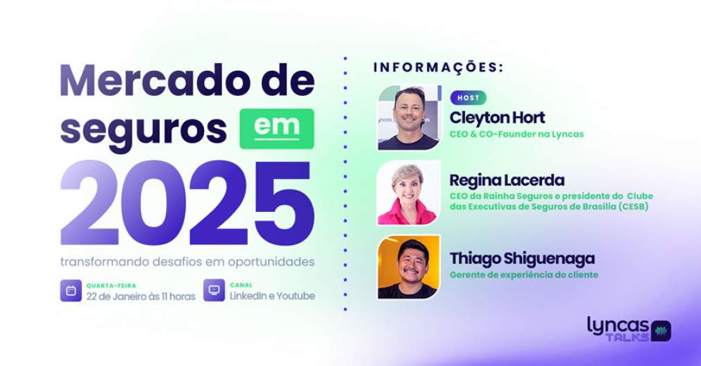 No dia 22 de janeiro, às 11 horas, o webinar Mercado de Seguros em 2025: Transformando Desafios em Oportunidades contará com a participação de Cleyton Hort, CEO e Cofundador da Lyncas, Regina Lacerda, CEO da Rainha Seguros e presidente do Clube das Executivas de Seguros de Brasília (CESB), e Thiago Shiguenaga, Gerente de Estratégia e Experiência do Cliente.