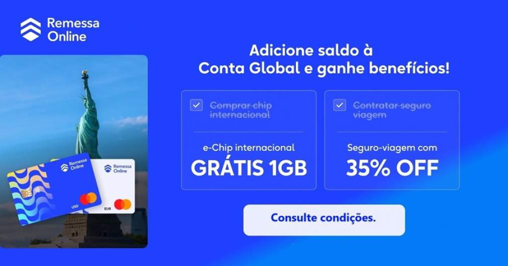 Pensando nesse público, a plataforma de transferência internacional, conta e cartão global Remessa Online está com uma campanha promocional para quem carregar sua conta global até o dia 31 de janeiro de 2025. Com uma recarga de no mínimo 200 euros (EUR) ou 200 dólares americanos (USD), o usuário terá acesso a benefícios exclusivos para quem deseja conectividade global e proteção durante suas viagens.