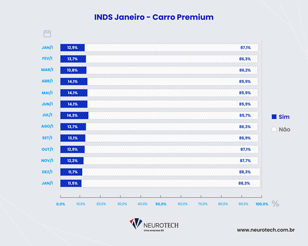 O Índice Neurotech de Demanda por Seguros (INDS) abrange o universo das principais seguradoras brasileiras e mensura o apetite do brasileiro a assegurar o seu automóvel. Nem todas as milhões de consultas mensais registradas se transformam em apólices contratadas, pois o processo depende de fatores como o perfil da pessoa que está fazendo a solicitação, o apetite ao risco da seguradora e se há ou não indícios de fraude.