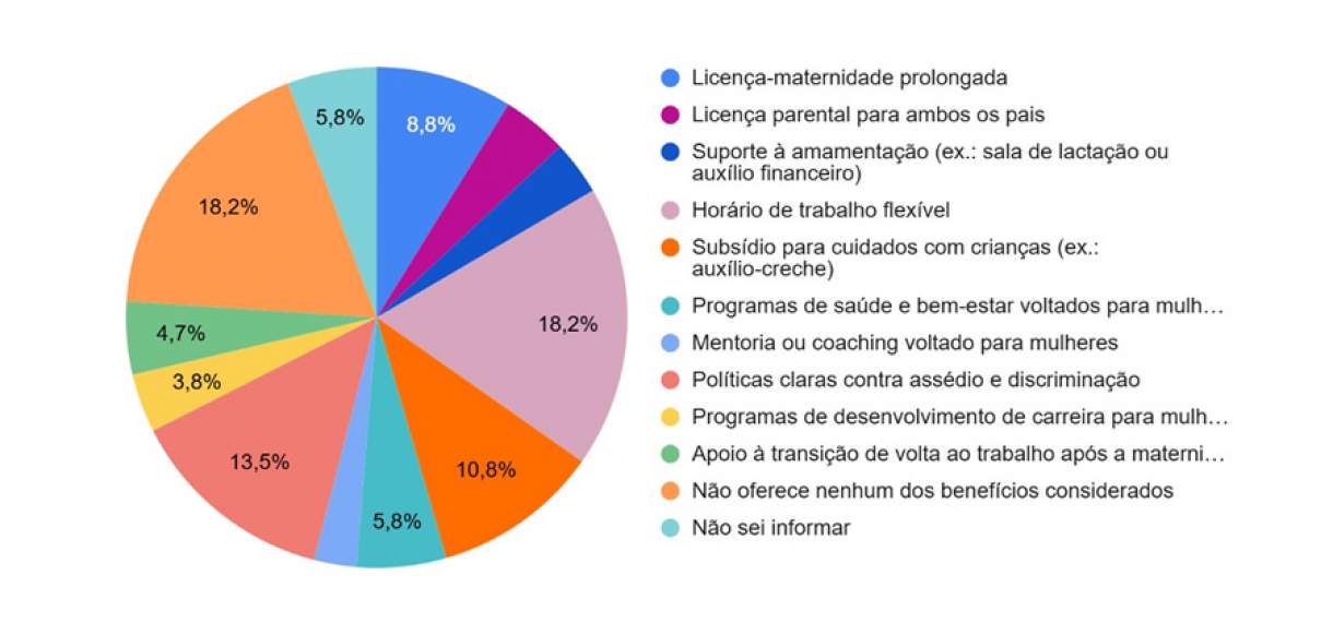 A pesquisa também revelou que 24% dos entrevistados não sabem informar ou afirmam que não existem benefícios voltados às necessidades das mulheres no ambiente de trabalho. Entre os benefícios mencionados, o horário flexível foi o mais representativo, citado por 18% dos participantes.