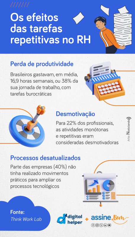 A pesquisa realizada pela Think Work Lab revelou como os RH´s ainda sofrem com a burocracia e falta de automação. Segundo os dados, os brasileiros gastam, em média, 16,9 horas semanais, ou 38% da sua jornada de trabalho, com tarefas burocráticas. Para cerca de 22% dos profissionais ouvidos, as atividades eram monótonas e repetitivas, aspectos considerados desmotivadores. Ainda, a grande maioria (40%) não realizou nenhum movimento prático para tornar a gestão de pessoas mais tecnológica e menos manuais. Nesse sentido, Mencaci listra cinco ferramentas úteis para iniciar essa atualização nos sistemas:
