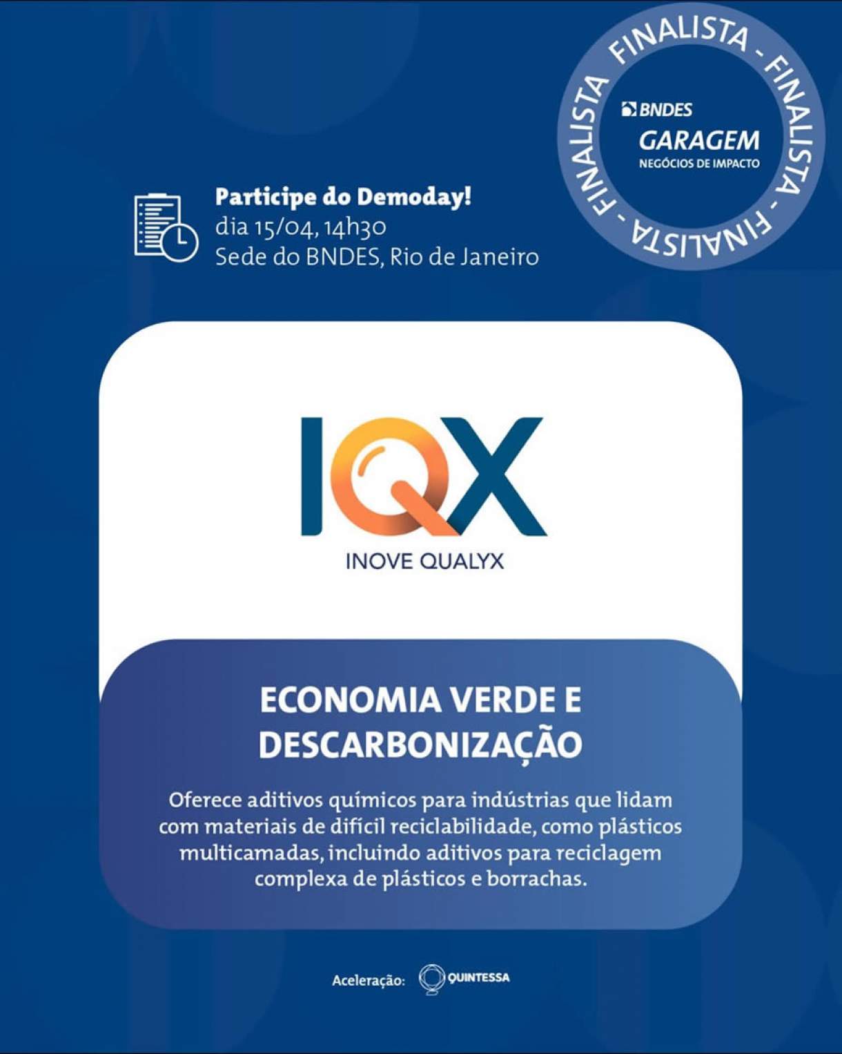 A IQX, startup de base científica com sede em Valinhos (SP), é uma das dez finalistas do ciclo 2024 do programa BNDES Garagem, iniciativa do Banco Nacional de Desenvolvimento Econômico e Social em parceria com a aceleradora de impacto Quintessa. A empresa oferece soluções para a "Economia Verde e Descarbonização", dentro da categoria de Tração, voltado para startups que já estão em operação e desejam escalar seus impactos. Entre mais de 1800 inscritas, apenas cinco startups nessa categoria alcançaram a fase final, e a IQX estará no Demoday, em 15 de abril, na sede do BNDES, no Rio de Janeiro.