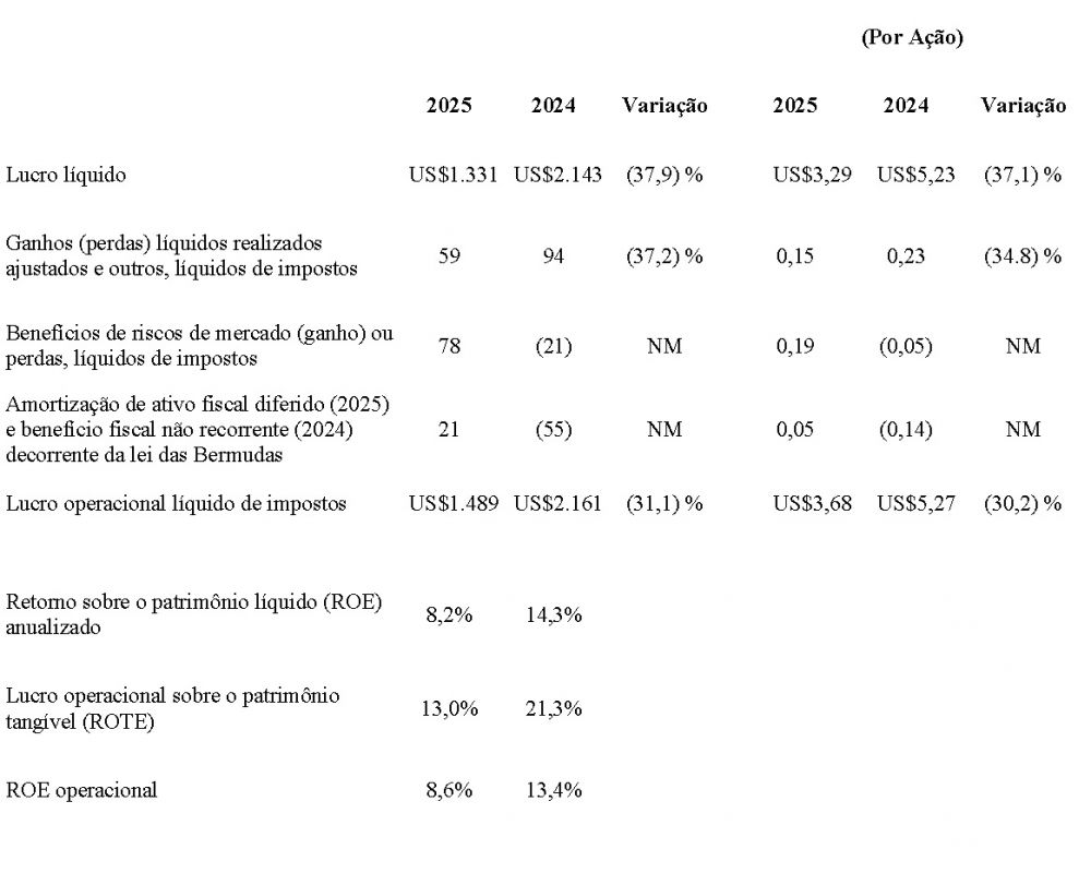 Nosso índice combinado foi de 95,7%, com resultado de subscrição de US$ 441 milhões — um desempenho notável, considerando US$ 1,6 bilhão em perdas por catástrofes. Excluindo essas perdas, o índice combinado do ano corrente foi de 82,3%, uma melhora de quase 1,5 ponto percentual em relação ao ano anterior, com aumento superior a 12% no resultado de subscrição, receita ajustada de investimentos de US$ 1,7 bilhão (+12,7%) e lucro com seguros de vida de US$ 291 milhões (+8,6%)."