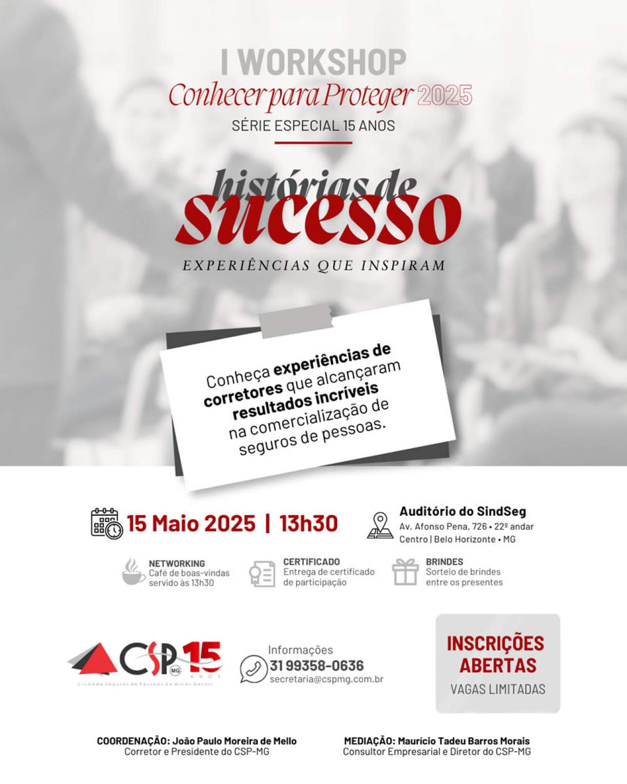 O Clube de Seguros de Pessoas de Minas Gerais (CSP-MG) inicia, no próximo dia 15 de maio, a edição 2025 da série de workshops Conhecer para Proteger, uma das iniciativas mais tradicionais da entidade. Este ano, o projeto celebra os 15 anos do Clube com uma proposta inovadora: destacar histórias de sucesso que inspiram, por meio de experiências reais de corretores parceiros das companhias beneméritas.