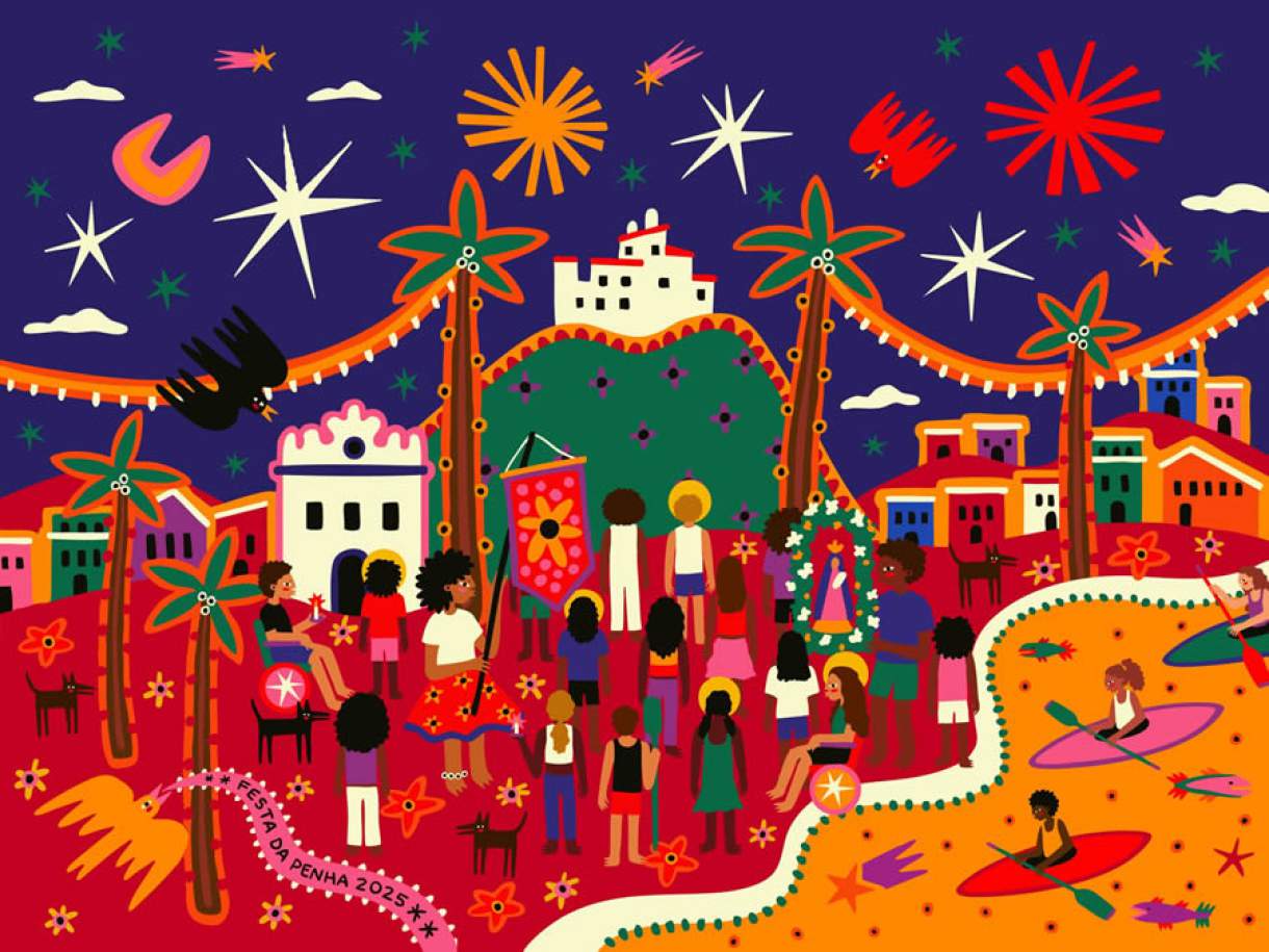 Um dos maiores destaques da ação foi a projeção da ilustração na Igreja do Rosário, que levou ainda mais poesia e emoção às ruas. O trabalho é da artista capixaba Amanda Lobos, nascida e criada em Vila Velha. Conhecida por seu estilo visual marcante – repleto de texturas e referências à cultura popular –, Amanda escolheu um caminho criativo que deu protagonismo às pessoas que fazem a festa acontecer: conquistas, remadores, mulheres, pessoas com deficiência e tantos outros grupos que compõem a diversidade das romarias.