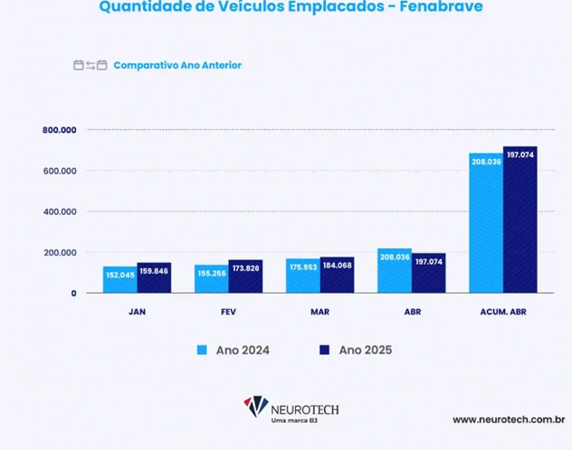 Segundo a Federação Nacional da Distribuição de Veículos Automotores (Fenabrave), as vendas de automóveis e comerciais leves, em abril, apresentaram um leve recuo de 5,27%, em relação ao mesmo mês do ano anterior. “Vale lembrar que em 2024 foi registrado o melhor mês de abril, em termos de vendas, desde 2019, o que eleva o patamar de comparação. Isso não significa baixa de vendas em abril deste ano, tendo inclusive um crescimento de 7% contra março, com quase 200 mil unidades vendidas”, ressalta Daniel Gusson.