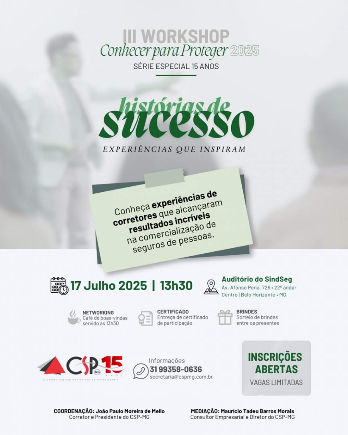 “A cada edição, fortalecemos nosso propósito de disseminar conhecimento prático e valorizar a atuação dos corretores de seguros, que estão na linha de frente da proteção da sociedade. Essa série especial dos workshops tem sido uma grande celebração do nosso compromisso com o desenvolvimento do setor ao longo dos últimos 15 anos”, destaca o presidente do CSP-MG, João Paulo Moreira de Mello.