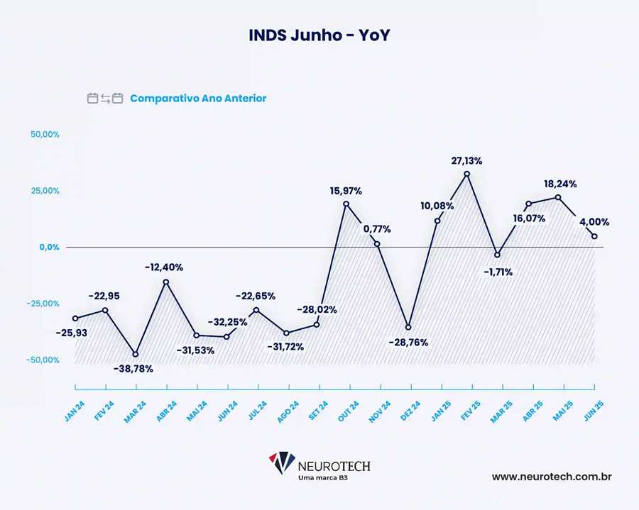 A demanda do mercado brasileiro de seguros de automóveis cresceu 4% em junho, na comparação com o mesmo mês em 2024. Já em relação ao mês anterior, maio de 2025, houve queda de quase 13%. Os dados são do Índice Neurotech de Demanda por Seguros (INDS), que mede mensalmente o comportamento e o volume das consultas na plataforma da Neurotech, empresa pioneira em soluções de inteligência artificial aplicadas a seguros e crédito.