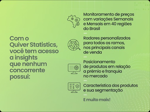 Quiver by Dimensa: "Como eu sei se o prêmio de meus produtos estão de acordo com o mercado?" "Por que alguns clientes cancelam e outros não?" "Qual região tem mais potencial?"