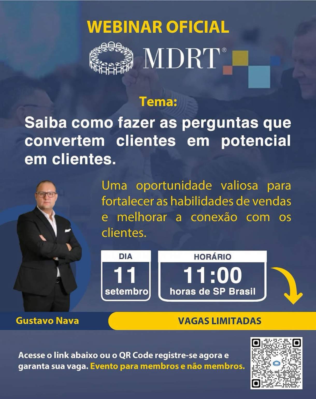 “Nosso objetivo é democratizar o acesso ao conhecimento e mostrar, na prática, como técnicas bem aplicadas podem transformar o relacionamento com os clientes. Este webinar é uma oportunidade para que tanto membros quanto não-membros da MDRT possam evoluir juntos e fortalecer ainda mais a profissão”, destaca Felipe Sousa, Zone Chair da MDRT na América Latina.