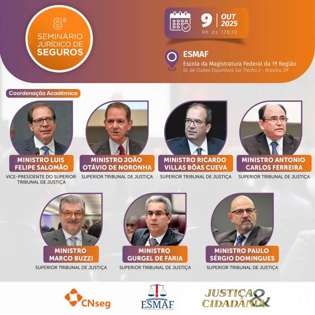 A Revista Justiça & Cidadania promove, no dia 9 de outubro, a oitava edição do Seminário Jurídico de Seguros, em parceria com a Confederação Nacional das Empresas de Seguros Gerais, Previdência Privada e Vida, Saúde Suplementar e Capitalização (CNseg).