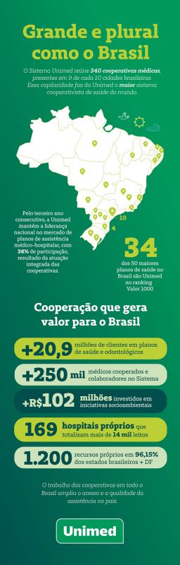Em 58 anos de atuação, a Unimed se destaca na liderança do setor de saúde suplementar. A marca nasceu com a fundação da Unimed Santos (SP), em 1967, e hoje compõe um sistema de 340 cooperativas médicas e empresas, que estão presentes em nove de cada dez cidades brasileiras e atendem a 20,9 milhões de pessoas em planos de saúde e odontológicos. A Unimed reúne 118 mil médicos cooperados, gera cerca de 150 mil empregos diretos e dispõe da maior rede assistencial do país, com 30 mil estabelecimentos parceiros, além da rede própria, formada por 169 hospitais e hospitais-dia, unidades de urgência e emergência, centros de diagnósticos e serviços de terapias especiais, entre outros. Motor do setor da saúde na economia, injetou mais de R$ 96 bilhões nos serviços de saúde privados em 2024, com a realização de 665 milhões de eventos assistenciais (consultas, exames, internações e outros procedimentos).