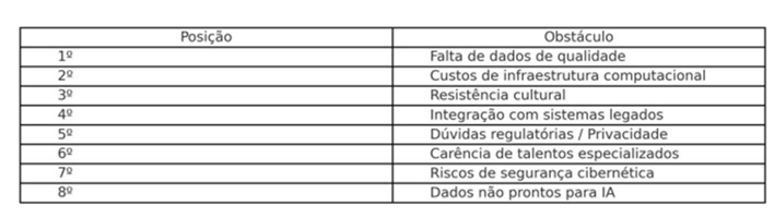 A percepção sobre recursos financeiros se conecta diretamente aos principais obstáculos enfrentados na implementação da IA, que vão além da questão orçamentária e revelam um conjunto multifacetado de desafios (tabela abaixo).
