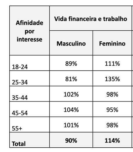 - Análise feita a partir de menções nas redes sociais indica que mulheres demonstram 114% mais afinidade com temas relacionados a trabalho e satisfação, já os homens apresentam 90%