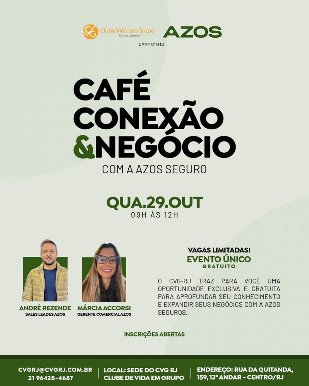 O Clube de Vida em Grupo do Rio de Janeiro (CVG-RJ) convida os corretores de seguros para um café no dia 29 de outubro, em sua sede, com a AZOS Seguros, em uma manhã dedicada a networking estratégico e geração de negócios.
