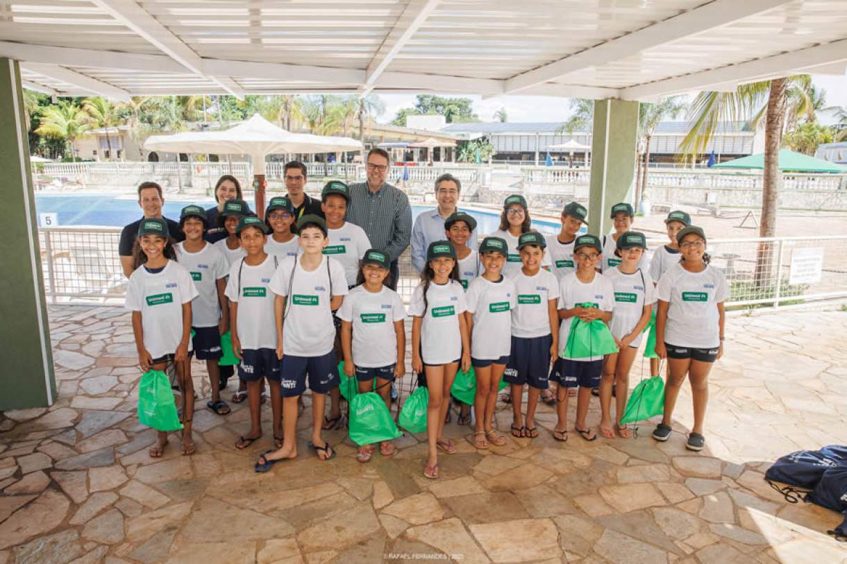 A Unimed Ribeirão Preto realizou, no início de novembro, a entrega de novos kits esportivos às crianças do projeto social “Nadando na Frente”, no Clube de Campo dos Comerciários, na zona leste da cidade. Cada kit contém maiô ou sunga, touca, óculos, boné, camiseta e mochila - itens essenciais para o desempenho das aulas e o estímulo à prática esportiva.