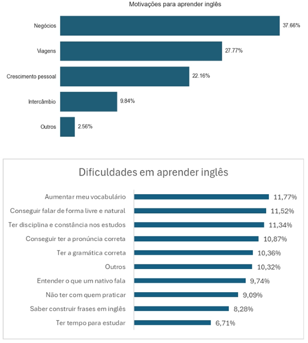 Veja no gráfico abaixo o levantamento completo das motivações e dificuldades no aprendizado da língua: