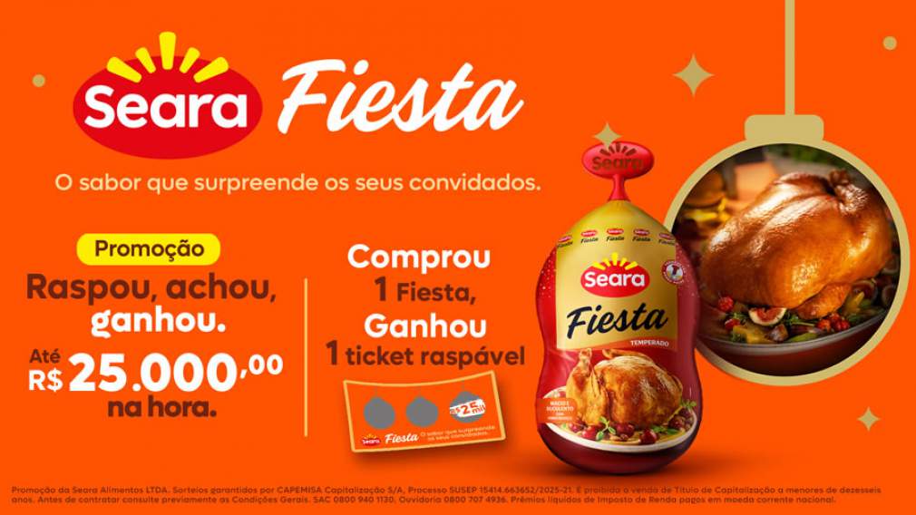 A Seara realiza a campanha “Fiesta - Raspou, Achou, Ganhou”, iniciativa que oferece 2.519 prêmios instantâneos em dinheiro a consumidores que adquirirem produtos da linha Fiesta em lojas participantes, incluindo um no valor de R$ 25 mil. O prazo para participação encerra no dia 24 de dezembro, e a ação reforça o uso do Título de Capitalização como ferramenta de incentivo no varejo alimentar.