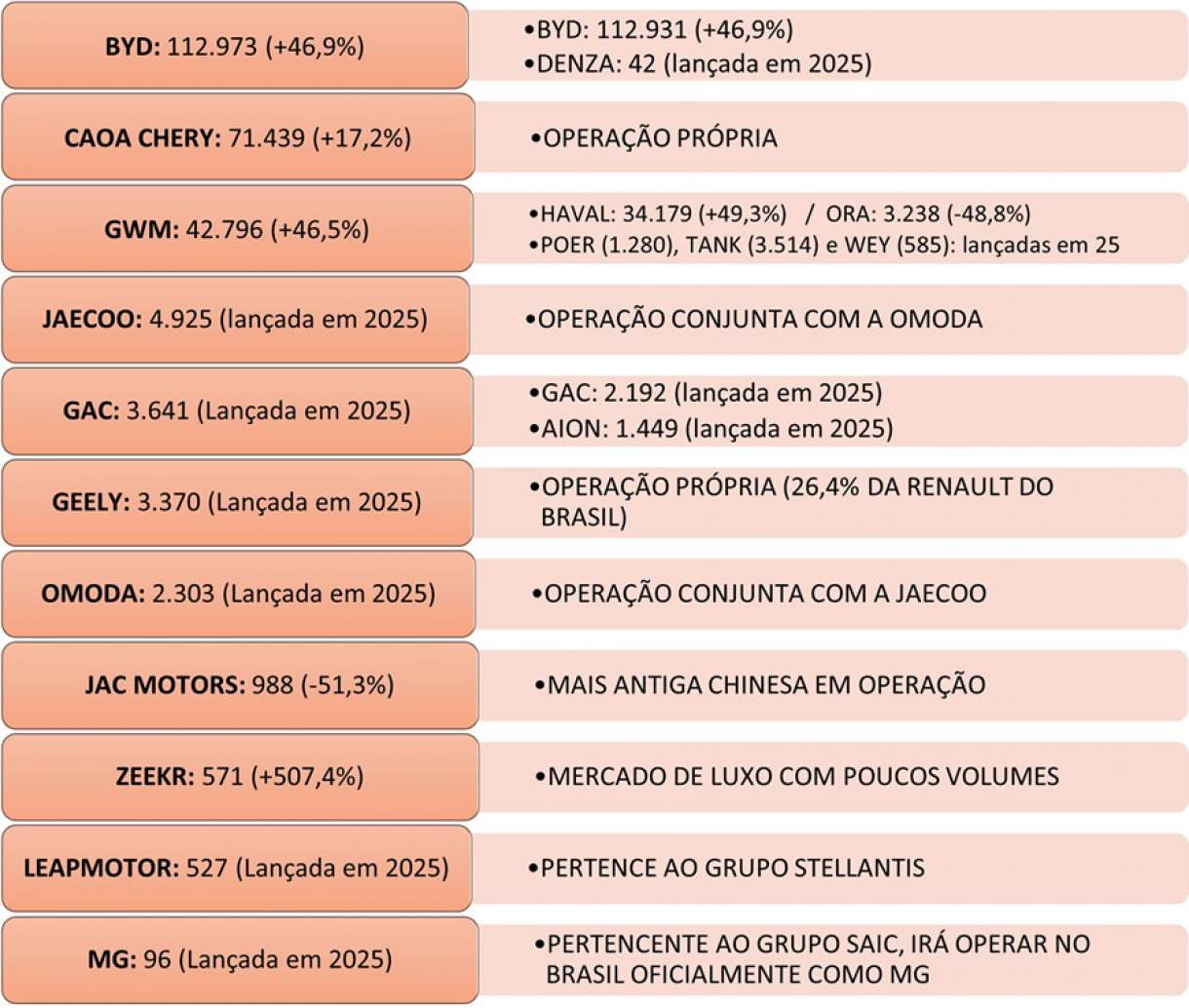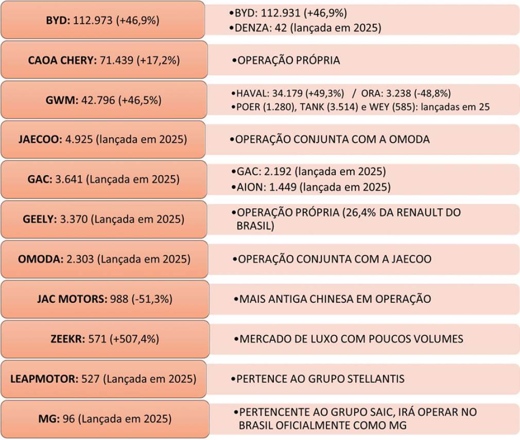 · Somadas, essas marcas acumularam 244,9 mil emplacamentos em 2025, um crescimento de 44,7% ante 2024
