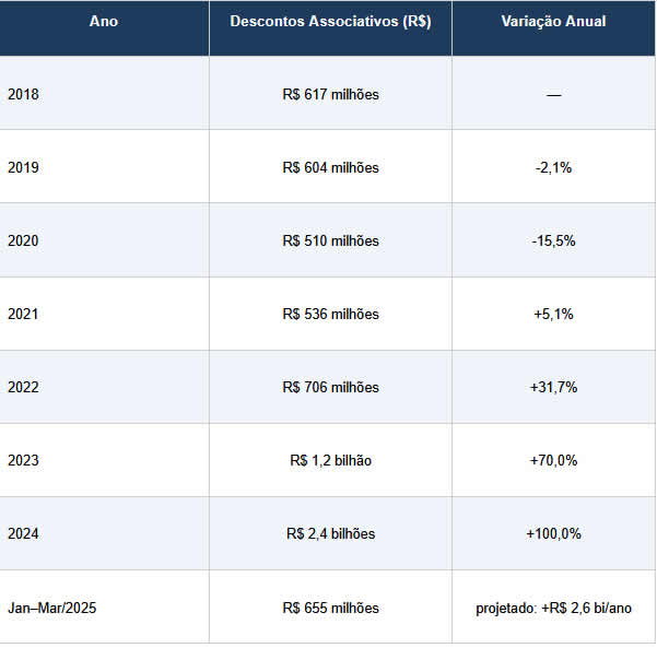 4. Portal da Transparência / Jornal Nacional (Rede Globo). Levantamento sobre descontos associativos 2018–2025. Publicado abr. 2025.